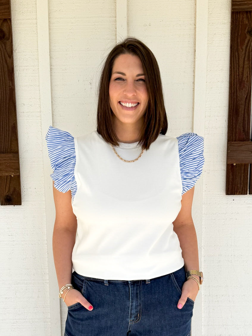 Meet your new go-to top that's anything but ordinary! The Rudy features playful bubble ruffled sleeves in striped poplin that add instant charm to your everyday look. Crafted from stretchy knit fabric with a fitted silhouette and classic ribbed neckline, this top hugs you in all the right ways while keeping you comfortable. Perfect for dressing up with jeans or pairing with your favorite skirt—it's the kind of piece that makes getting dressed fun.