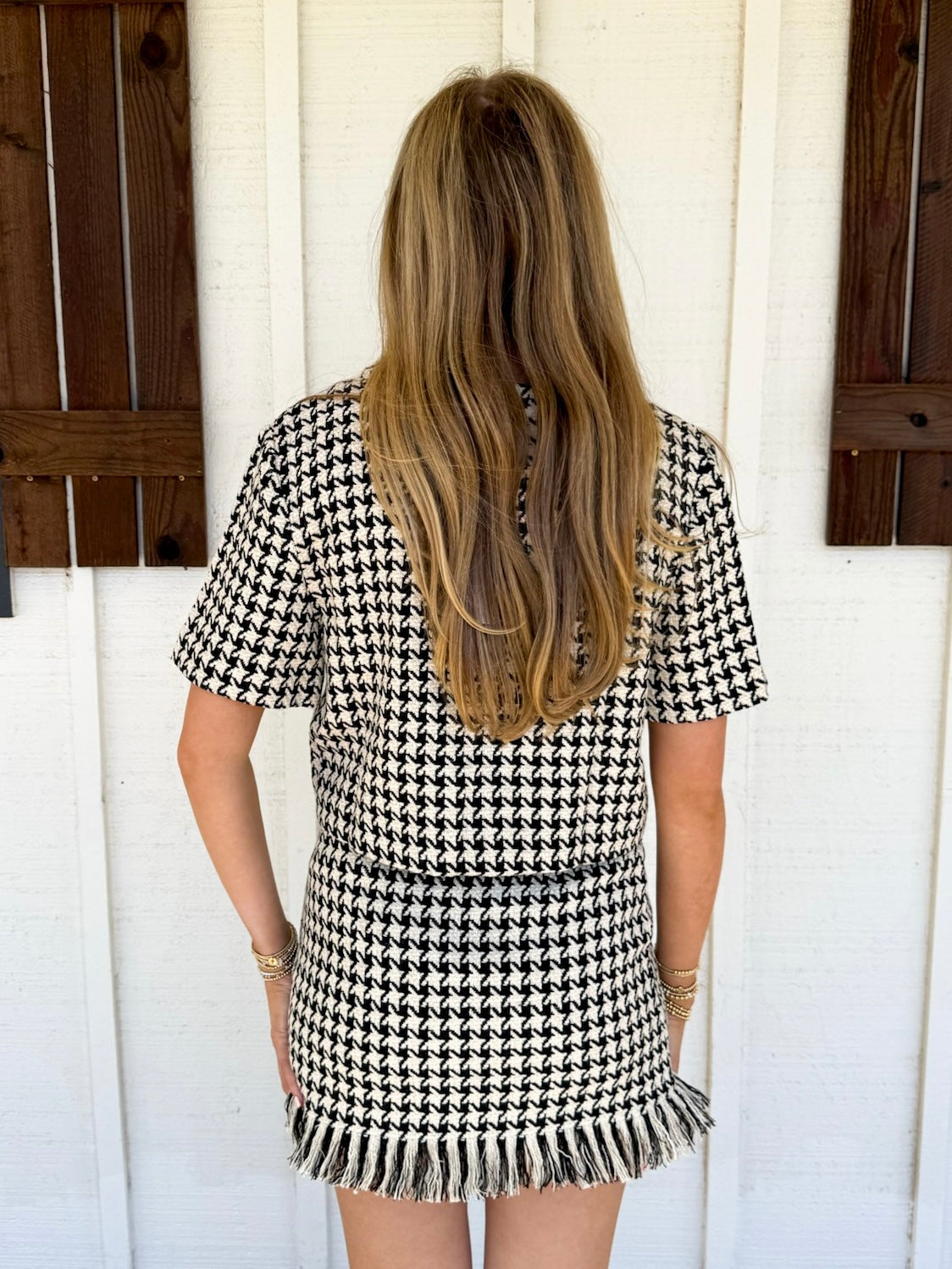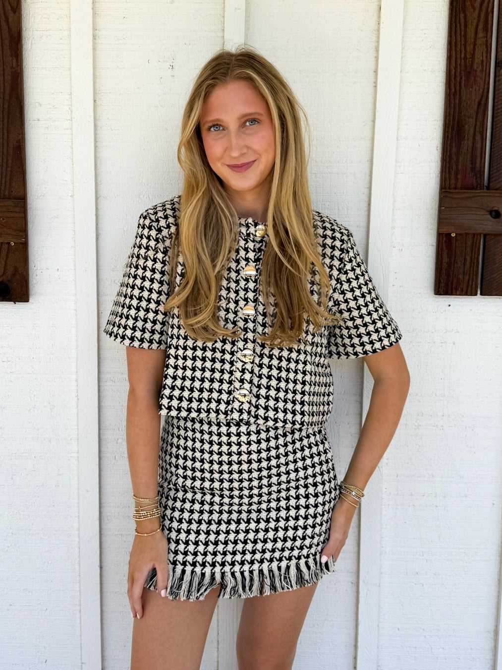 Elevate your style with The Connie Set—a playful two-piece combo that's pure pattern perfection. The houndstooth short sleeve cropped blouse features charming button details for an effortless put-together vibe, while the matching mini skirt brings the fun with flirty fringe trim. Mix, match, or wear them together for a look that's equal parts chic and spirited. Perfect for anyone ready to make a statement.