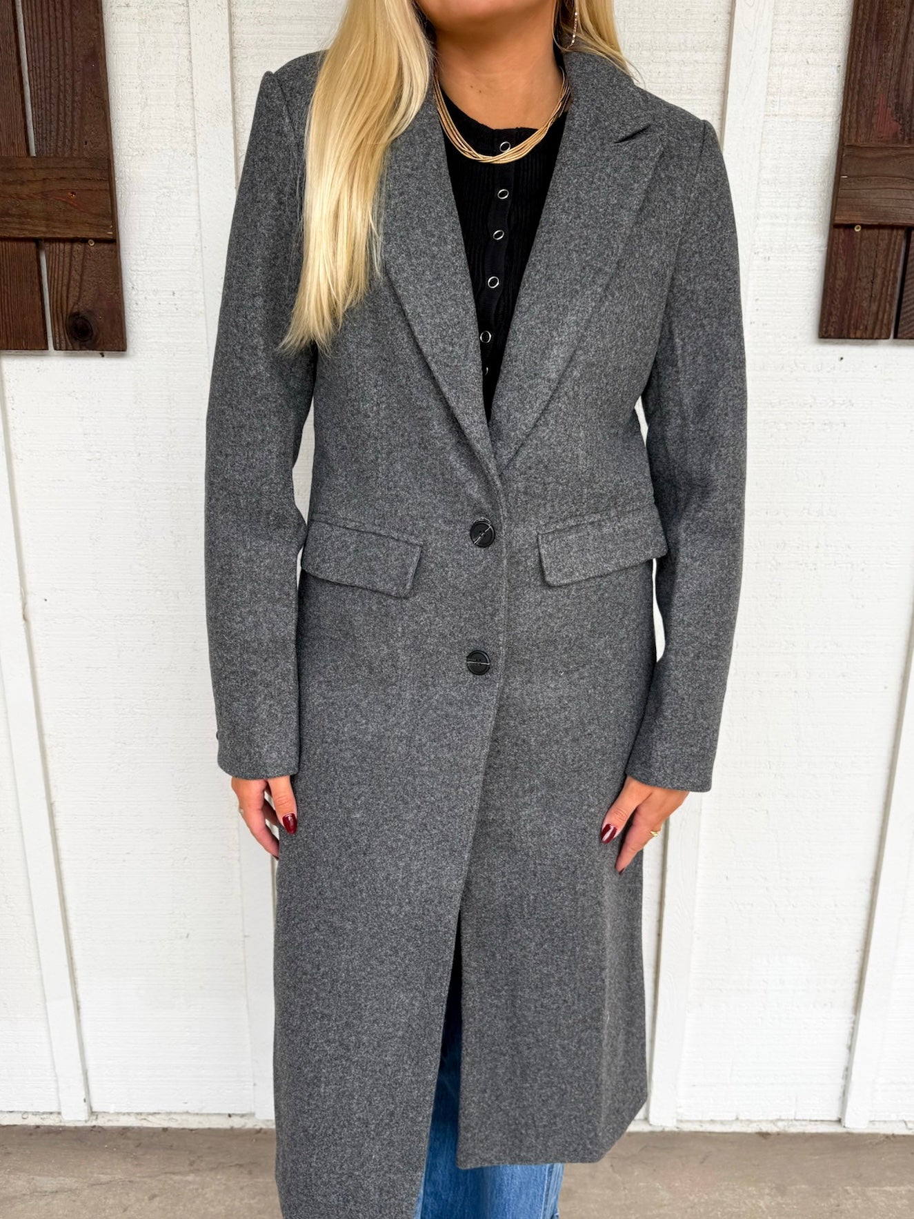 Meet The Hadlee Coat—your new favorite layer that's equal parts polished and playful. This longline stunner features a sharp notched collar, classic front buttons, and practical flap pockets to keep your essentials close. With long sleeves and an effortlessly chic silhouette, it's the kind of coat that works as hard as you do, whether you're running errands or making a statement. Throw it on and feel instantly put-together.