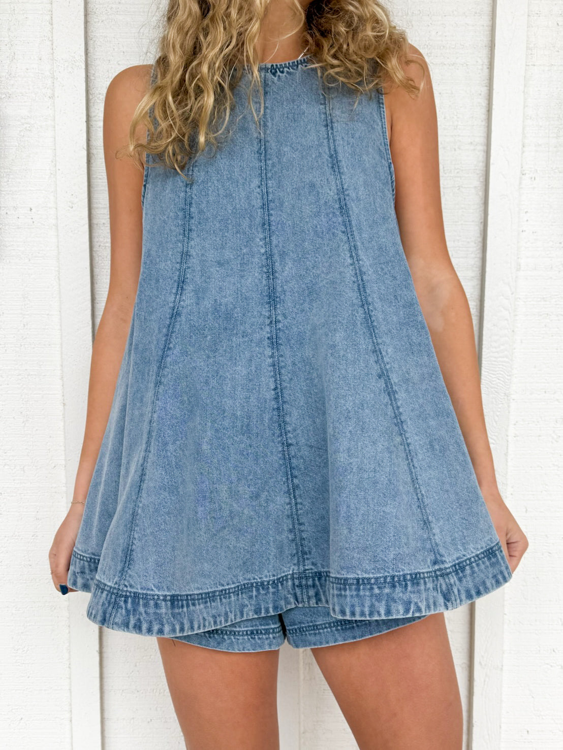 The Caroline Set brings effortless style with a sleeveless flared a-line denim top paired with comfortable solid elastic waist shorts. This dynamic duo works perfectly for warm-weather adventures, casual hangouts, or those days when you want to look put-together without trying too hard. The relaxed fit and classic denim fabric make it a versatile staple that transitions seamlessly from day to night. Mix, match, or wear together—either way, you're ready for whatever comes your way.