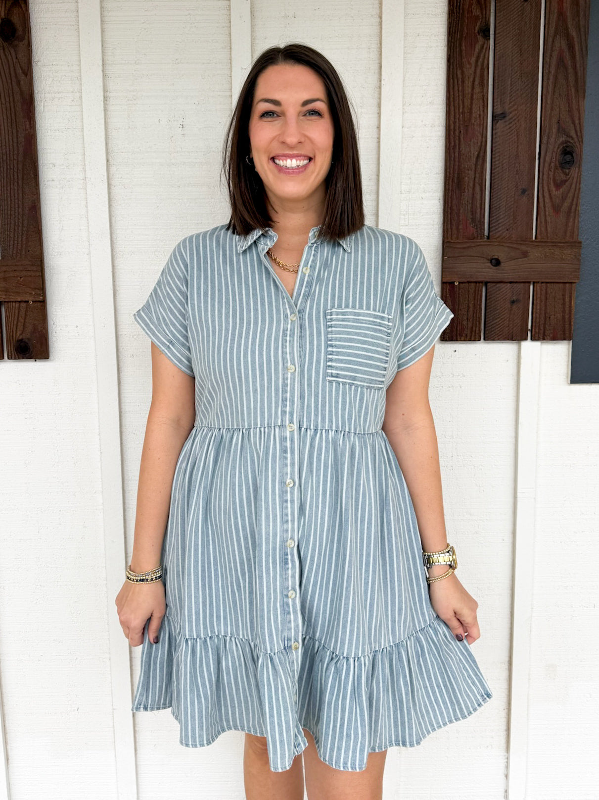 Effortlessly chic and undeniably fun, The Farrah Dress brings vintage-inspired charm to your everyday rotation. This striped button-down features a flattering tiered silhouette that adds movement and dimension, while the mini length keeps things fresh and flirty. Perfect for casual outings or dressing up with your favorite accessories, this dress proves that timeless style never goes out of style.