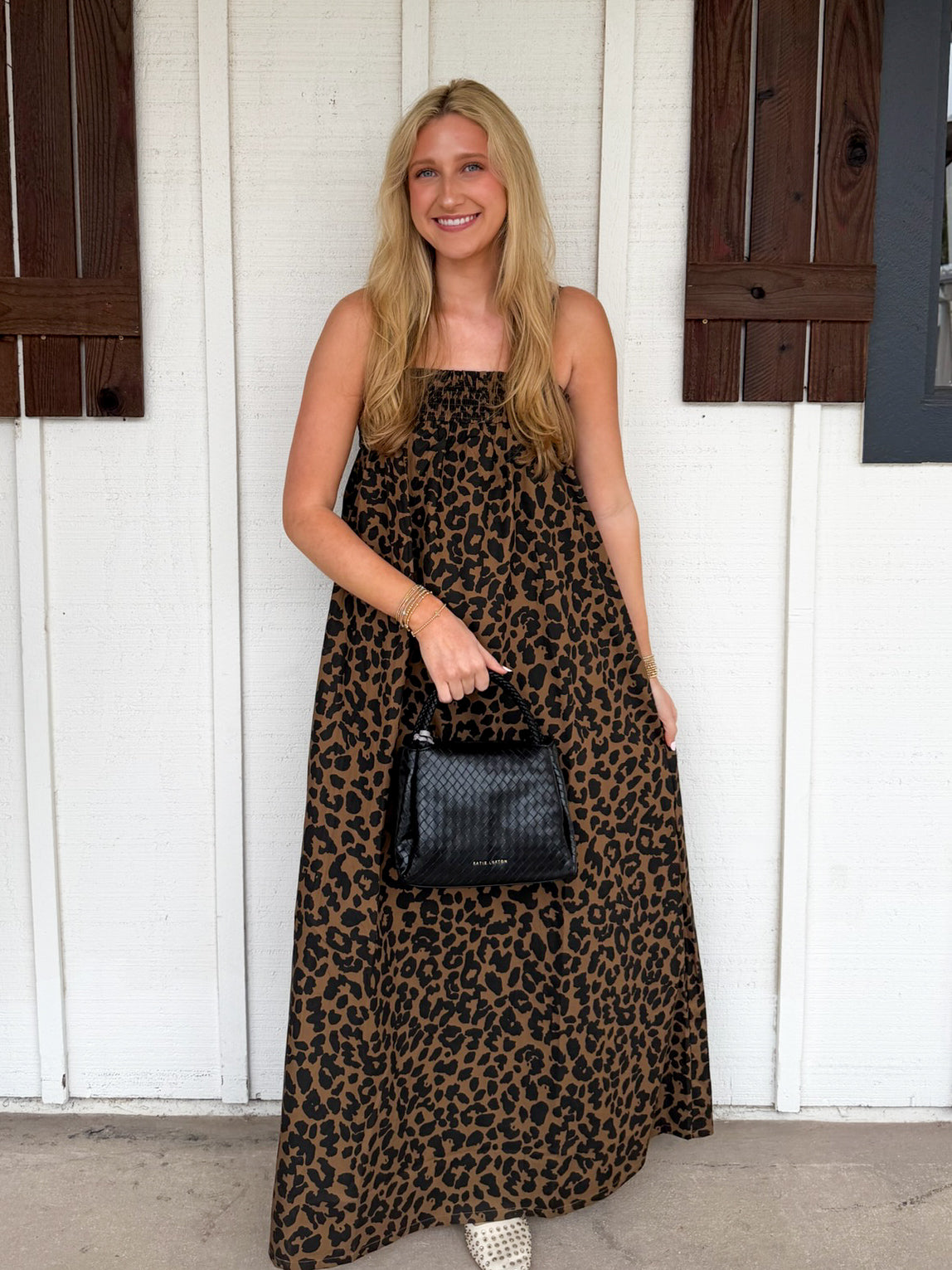 The Skylar Dress features a bold leopard print in a sleeveless silhouette that transitions seamlessly from day to night. This maxi dress offers effortless elegance with its flowing length and timeless animal pattern. Perfect for warm weather occasions, the sleeveless design keeps you cool while the maxi cut provides sophisticated coverage. Pair it with sandals for casual outings or dress it up with heels for evening events. A versatile wardrobe essential that works year-round.
