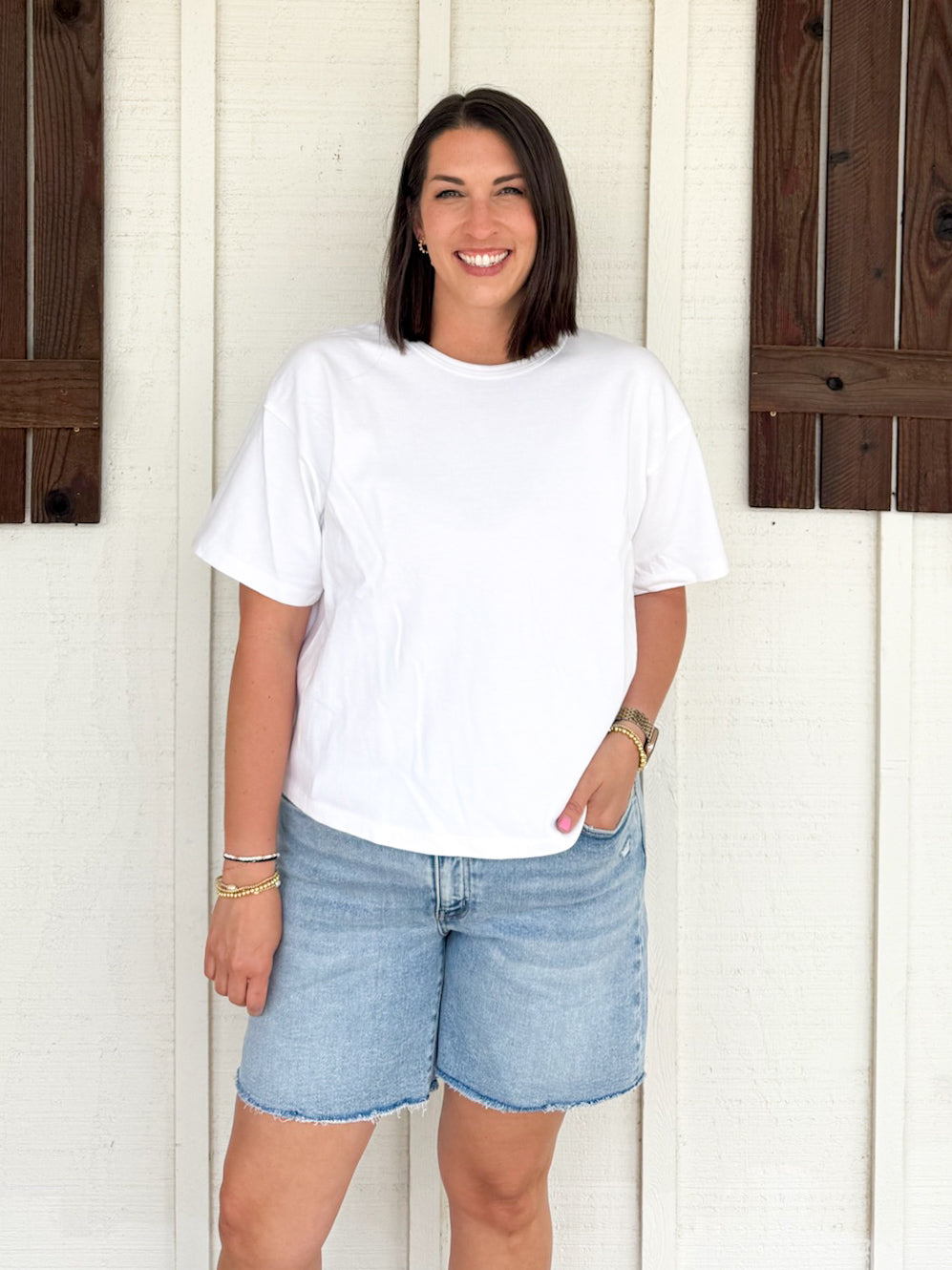 The Done Deal Shorts deliver effortless style with a high-rise waist that flatters and elongates. Crafted from comfort stretch denim in a versatile medium wash, these midi shorts feature a lightly distressed detail and raw hem for that perfectly lived-in look. Five functional pockets keep you practical, while the soft stretch fabric moves with you all day. A wardrobe essential that works from casual weekends to laid-back outings.