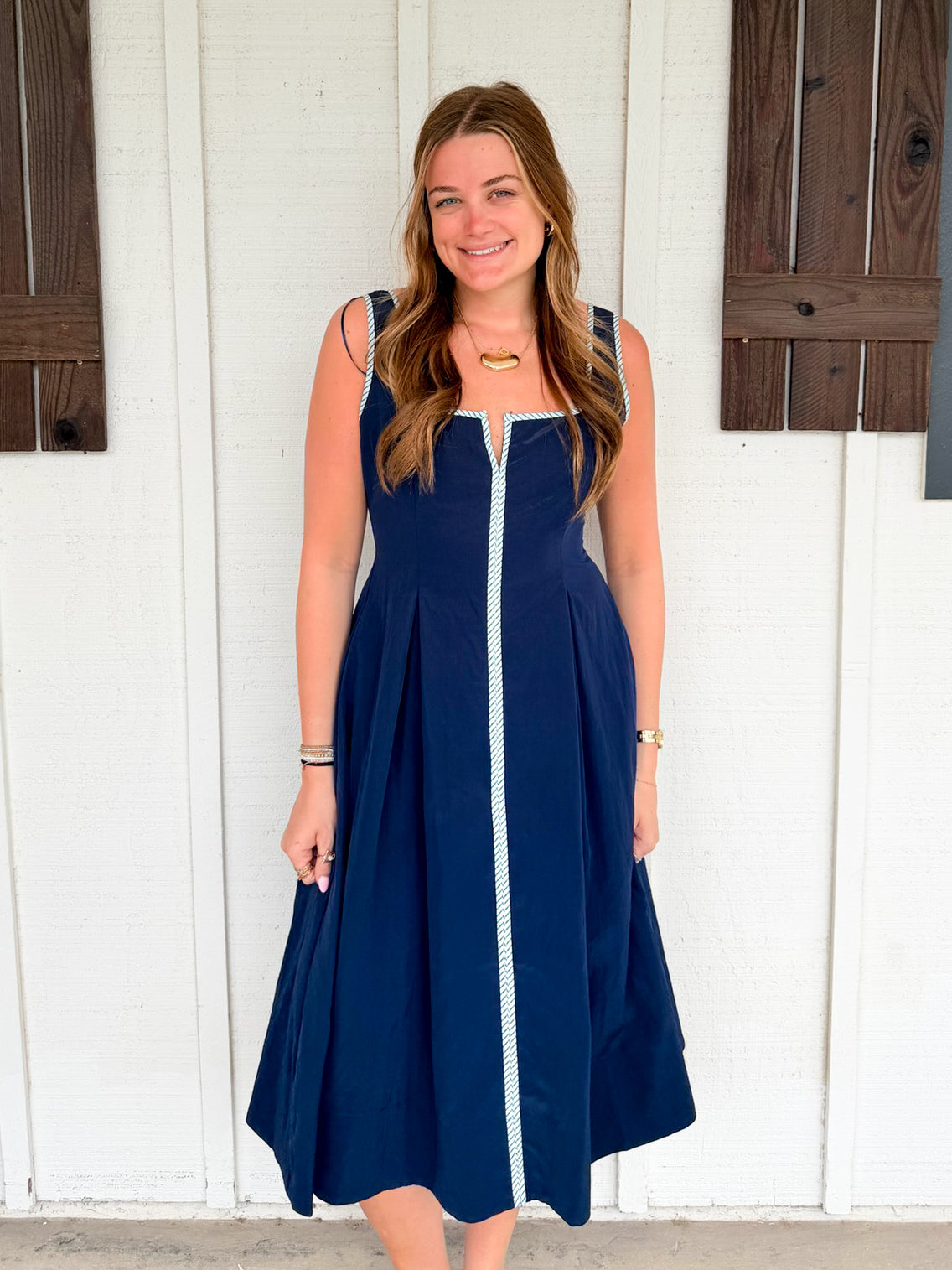 The Lorna Dress is a timeless midi silhouette featuring a chic square neckline and sleeveless cut that flatters the shoulders. Defined waist pleating creates elegant movement and dimension, while the midi length offers versatile styling for both casual and dressy occasions. Perfect for spring gatherings, garden parties, or elevated everyday wear.