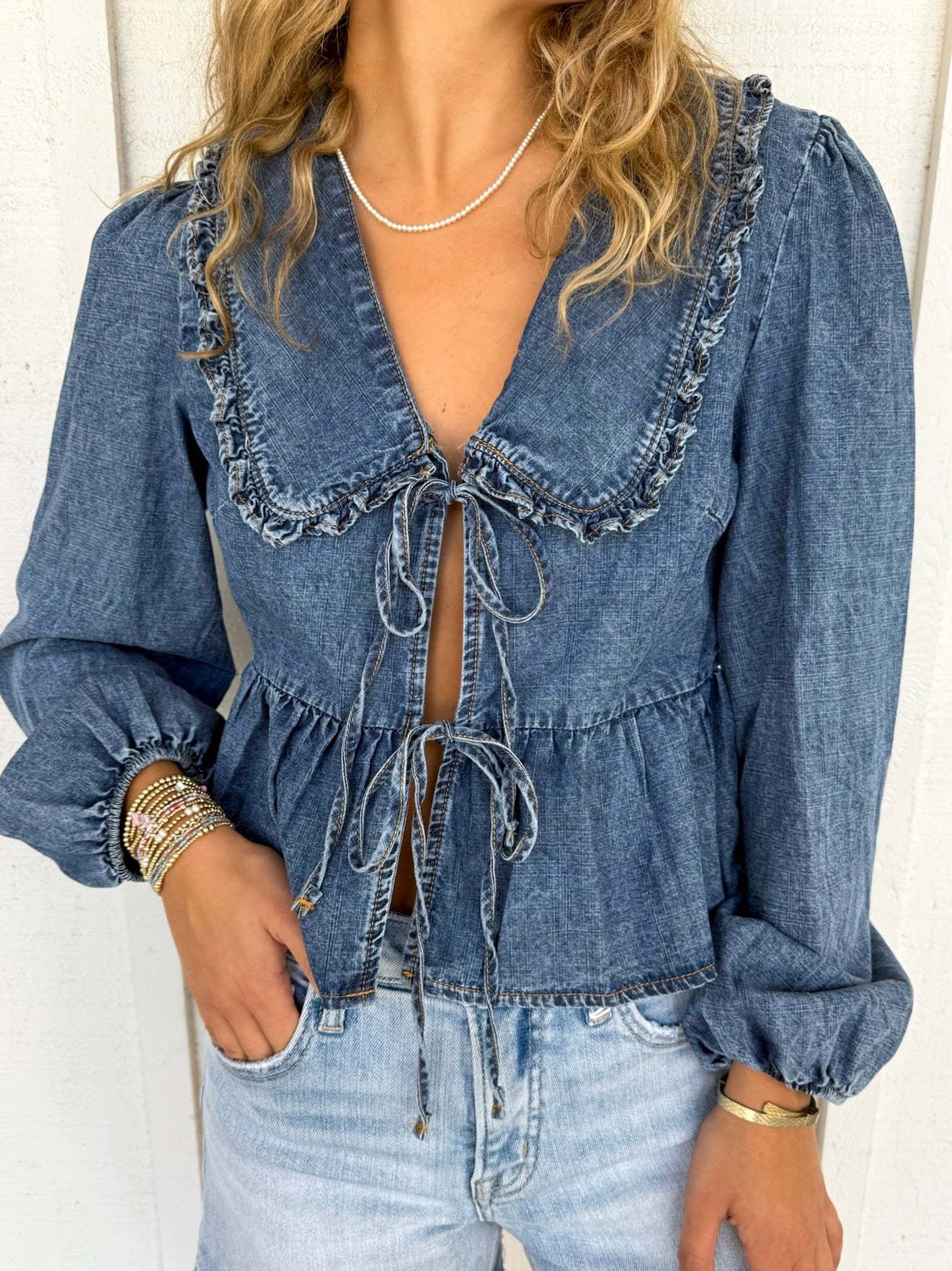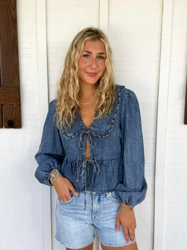 The Morgana Top brings a playful twist to classic style with its charming Peter Pan collar and long sleeves. Featuring a front tie strap detail, this blouse adds a flirty touch perfect for mixing and matching with your favorite skirts or jeans. Light and comfortable, it’s an easy way to brighten up your everyday wardrobe with a hint of vintage-inspired fun.