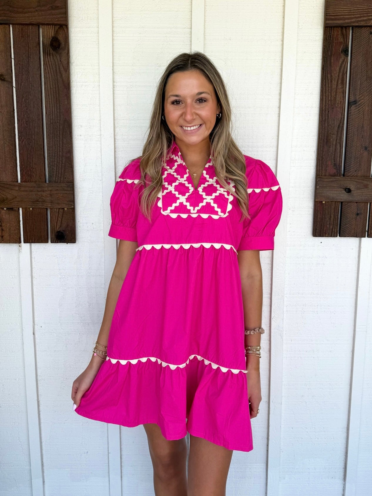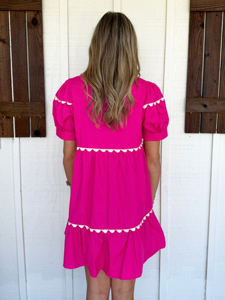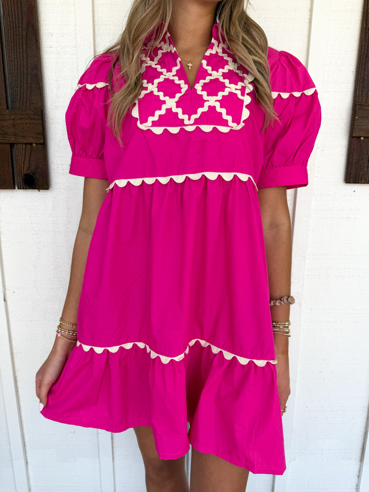 The Cathy Dress features puff sleeves and a relaxed babydoll fit for a comfortable and stylish look. The contrasting rickrack trim adds a touch of elegance while the tiered mini skirt adds dimension. With a classic collared neckline, this dress is perfect for any occasion. Not lined for a lightweight and breezy feel.