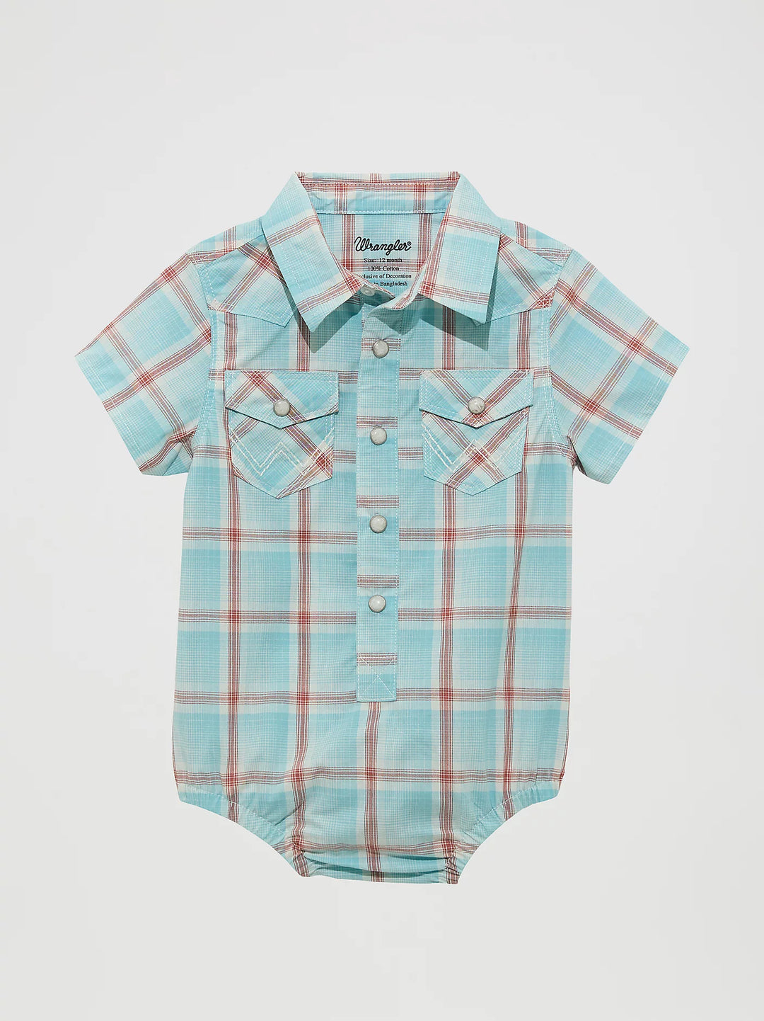 Your miniature man is ready for playtime and beyond in this plaid bodysuit. Bias Western yokes and snap pockets with our signature W embroidery give him our trademark style, while the three snap placket and seat closure also make it incredibly easy to wear.