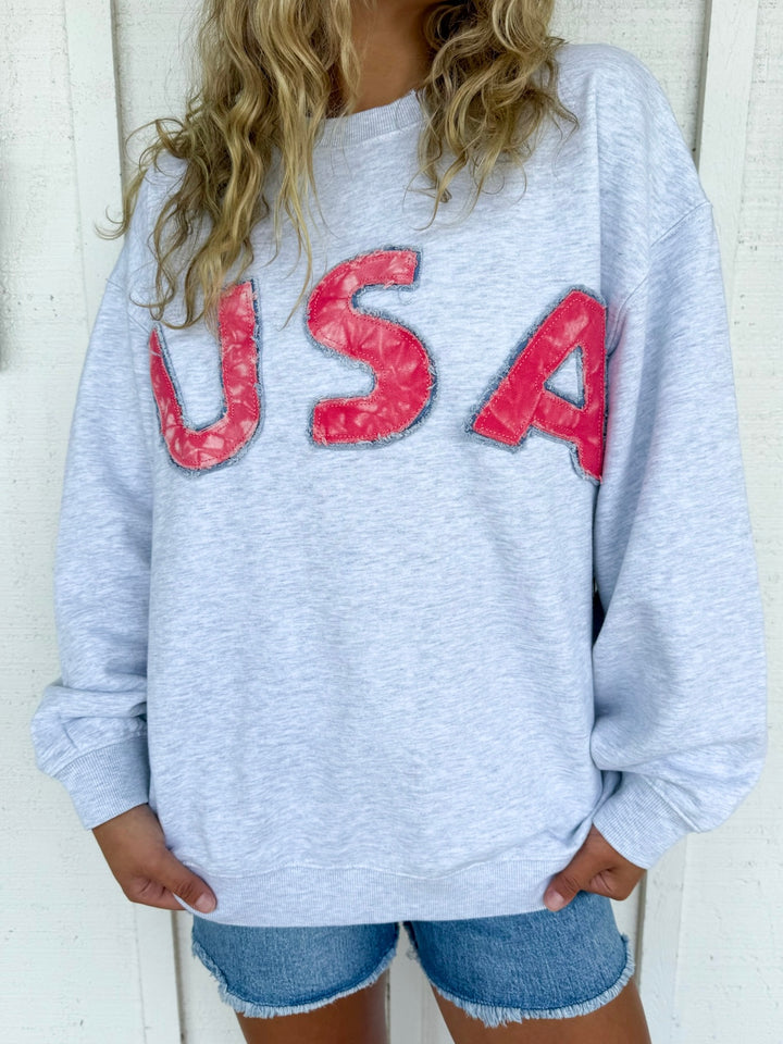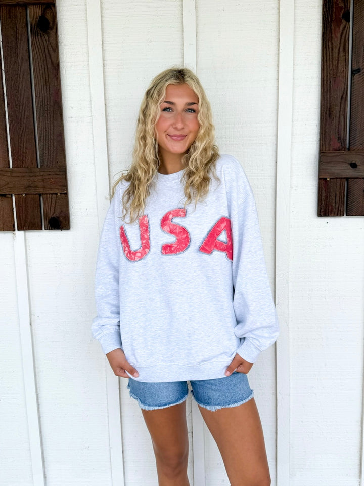 Wrap yourself in patriotic style with The Freedom Sweatshirt! This cozy grey and red french terry crewneck features a bold "USA" applique that lets your American spirit shine. Perfect for casual outings, backyard BBQs, or simply lounging in star-spangled comfort. Soft, stylish, and ready for your next adventure!