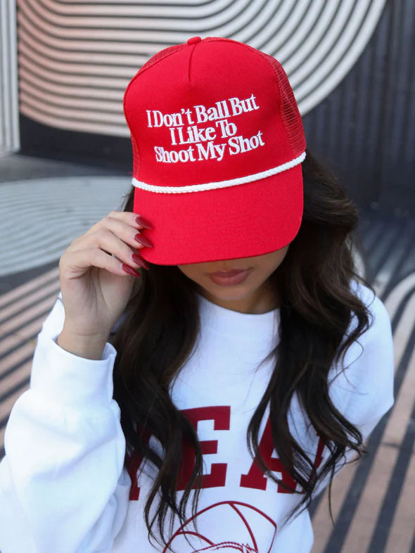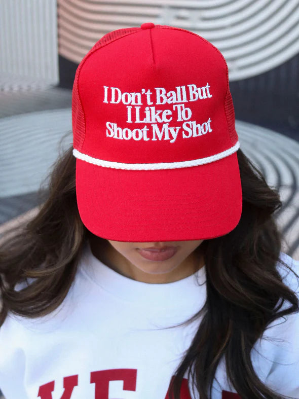 You miss 100% of the shots you don't take - so shoot your shot! This red trucker features white embroidery and rope detail!