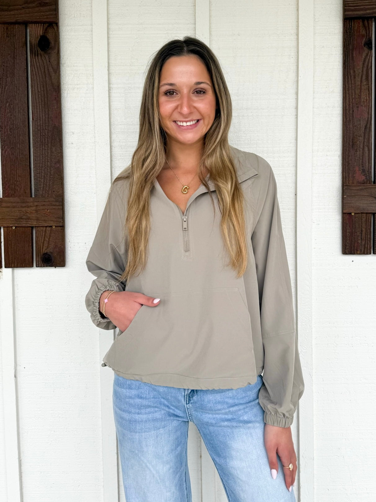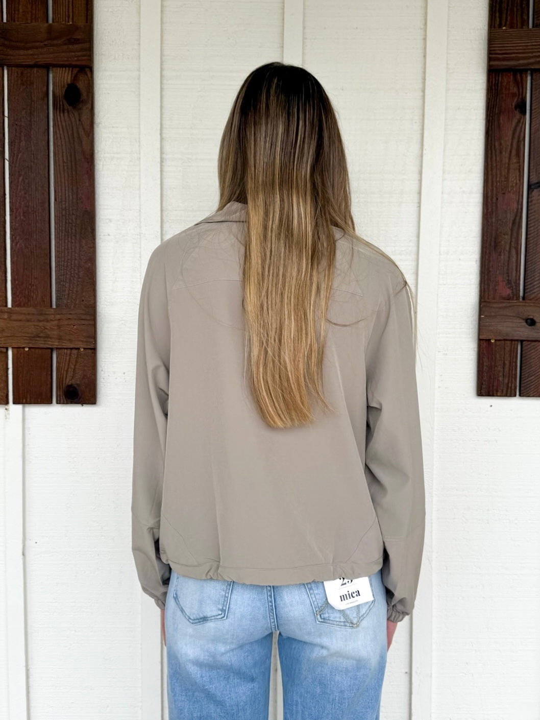Gracie in Stone is wearing a size Small. Height is 5’11”, Bust is 32, Waist is 25”-26”