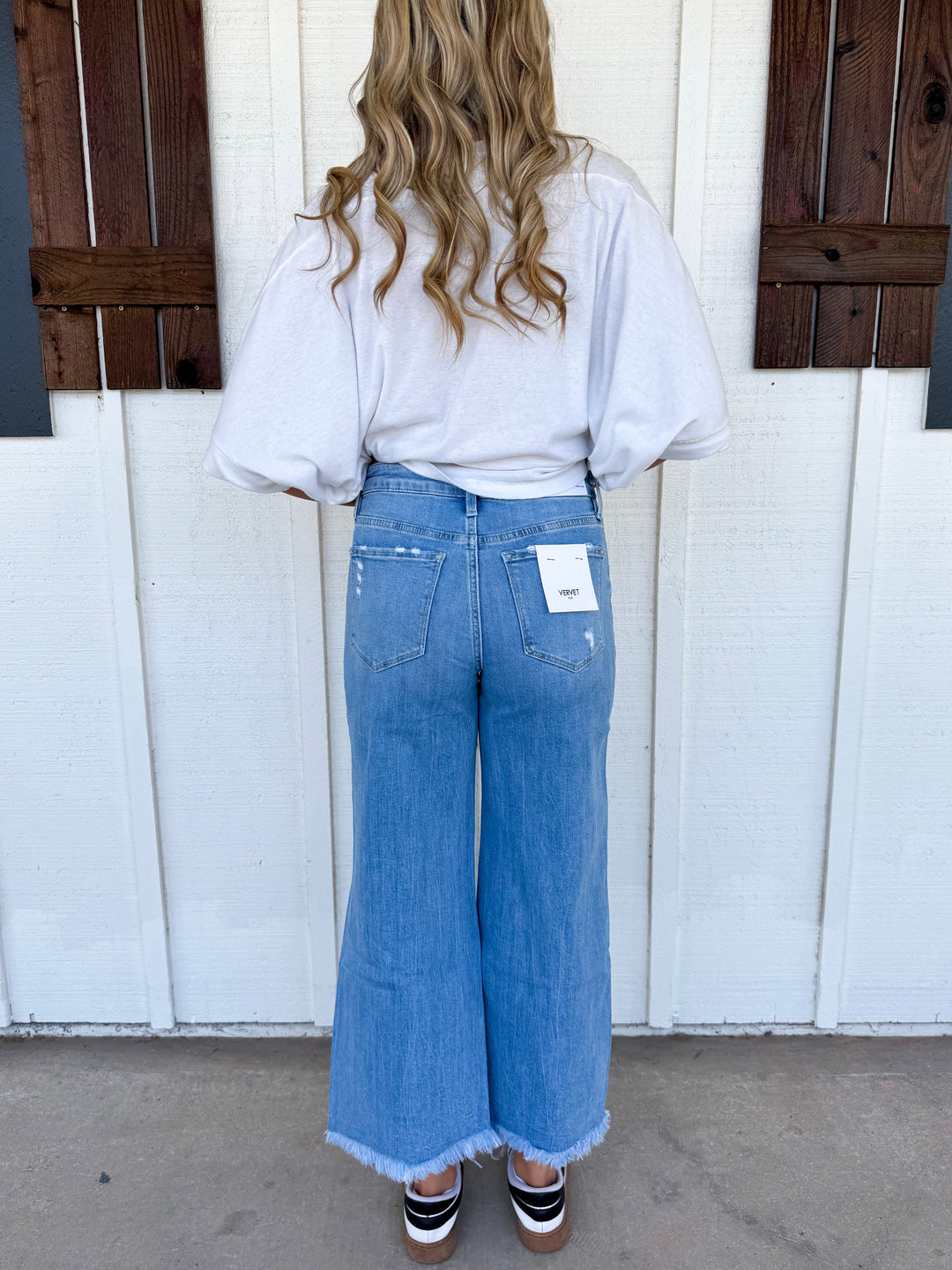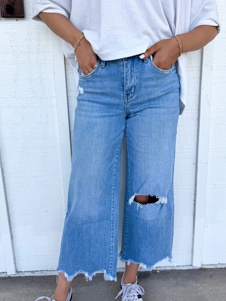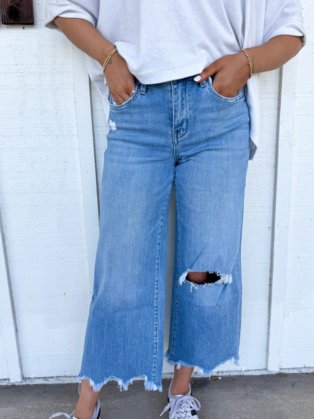Effortlessly chic and comfortable, The Spellbinding Jeans are your new go-to for any occasion. Crafted with comfort stretch denim, these high rise jeans feature a distressed detail and an uneven frayed hem for a trendy touch. The cropped length and wide fit make them a must-have for any fashion-forward wardrobe.