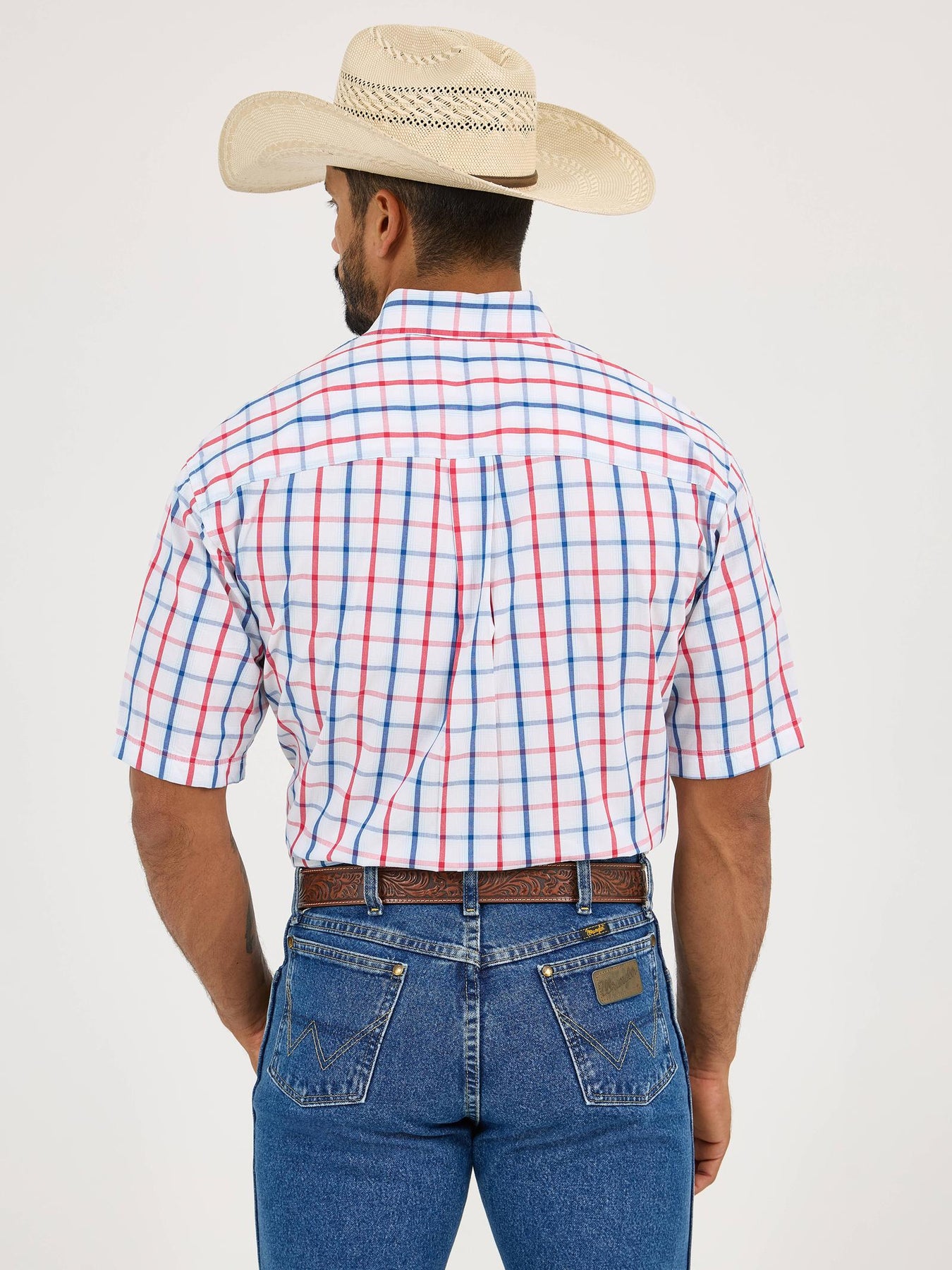 Elevate your wardrobe with the Wrangler Men's George Strait One Pocket SS Shirt. This trendy shirt features short sleeves, a button-down collar, and a straight back yoke for a stylish and comfortable fit. The one button-through pocket and two button adjustable cuff add a touch of functionality to this versatile shirt. Make a statement with Wrangler and feel confident all day long. 98% Cotton / 2% Spandex.